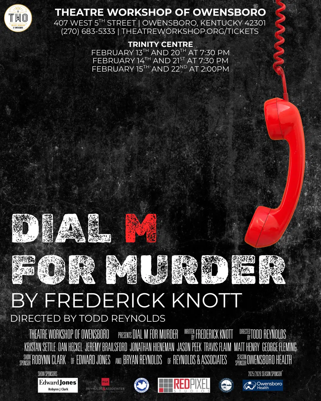 Dial M for Murder, directed by Todd Reynolds, will be performed at Trinity Centre on February 13-15 and 20-22. This production will be sponsored by Robynn Clark of Edward Jones and Bryan Reynolds of Reynolds & Associates.
